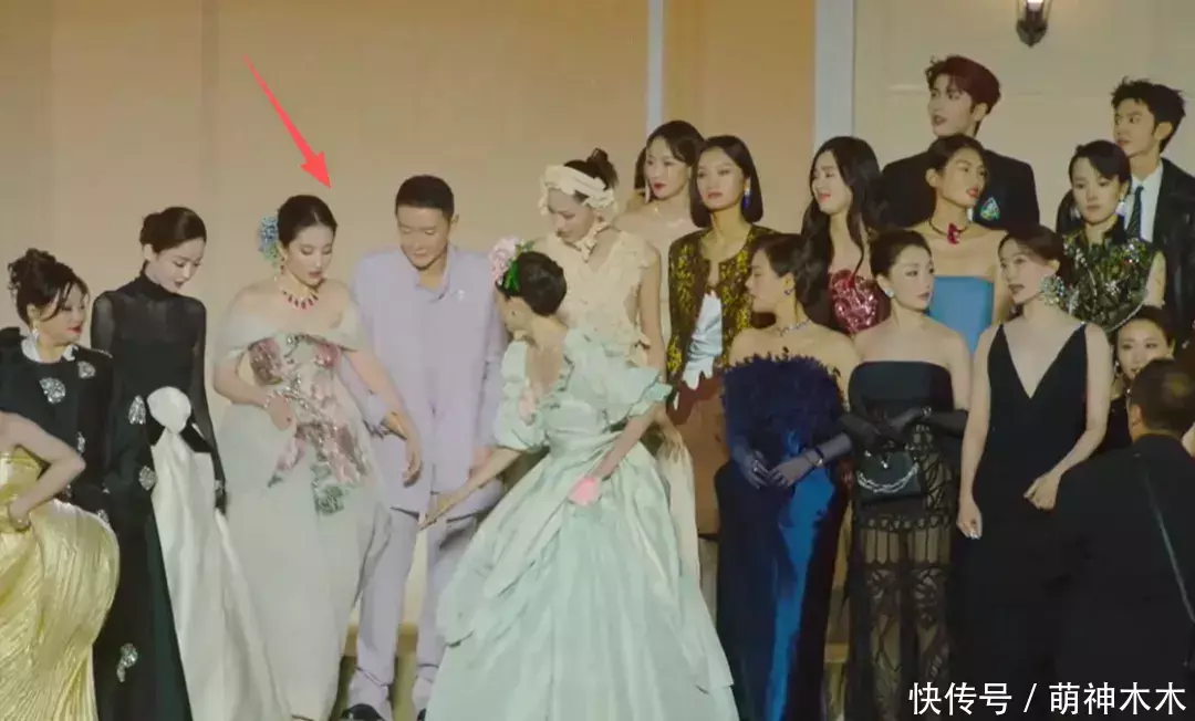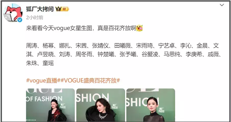 ——VOGUE主编刘冲牵着刘亦菲先出场占住C位,杨幂迟来一步,还是娜扎扶着她往中间站。