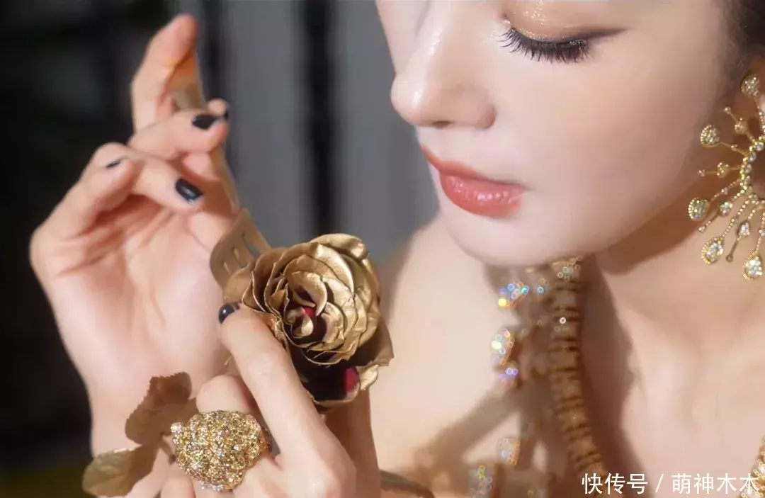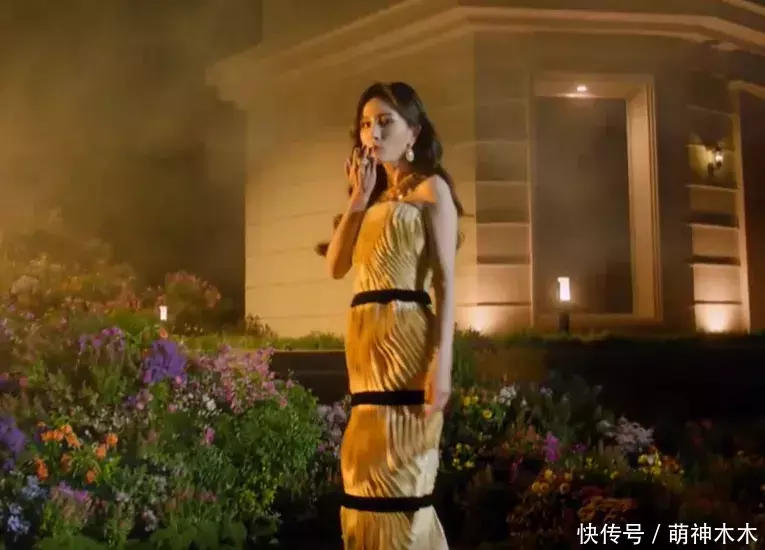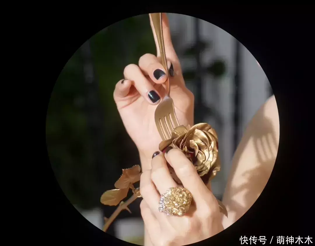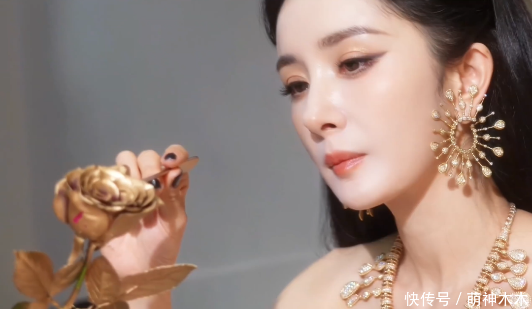 注意看,杨幂手拿刀叉,对着一朵玫瑰又是戳又是切,偏偏她切的玫瑰不是红色不是蓝色,而是金色。